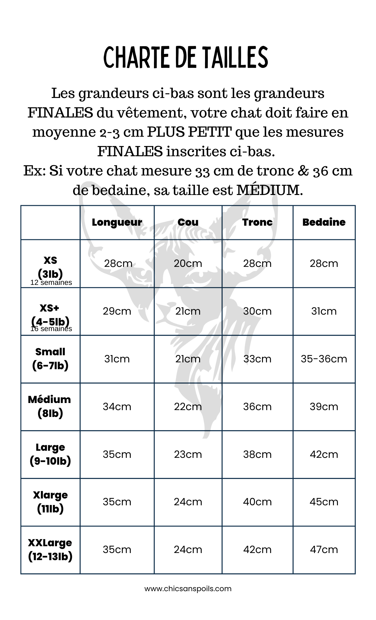 Le chat doit être debout sur ses 4 pattes, les mesures prises juste au corps sans espace, mais sans serrer !